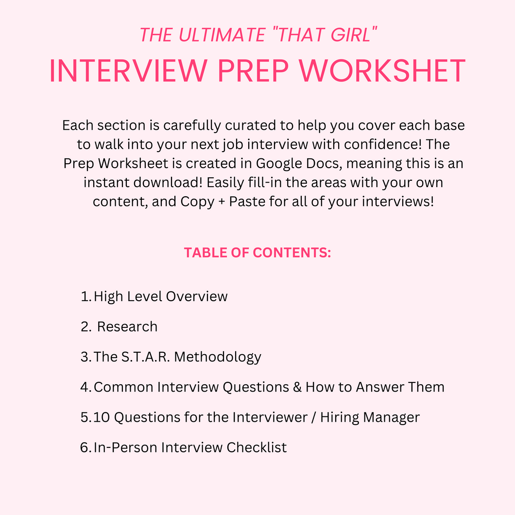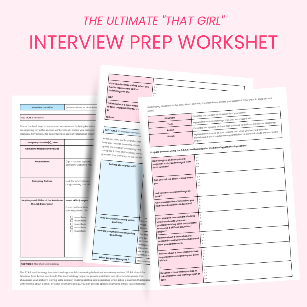 Looking to land your dream job and get hired? Look no further than this step-by-step interview preparation guide, the Ultimate "That Girl" Interview Prep Worksheet. Preparing for a job interview is crucial to increase your chances of success. This worksheet will provide you with useful tips and strategies to help you prepare effectively for your upcoming interview. This workbook is interactive and a guide to help you organize your thoughts so you can walk into interviews feeling like “THAT GIRL!”